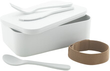 Box na jídlo z plastu PLA se sadou příborů (vidlička, lžíce a nůž) a polyesterovým elastickým páskem RPET, 1000 ml. Bez BPA, 100% kompostovatelný PLA.