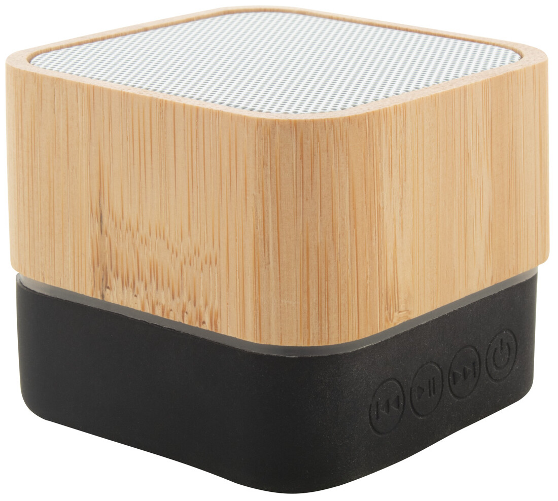 Bezdrátový reproduktor v bambusovém pouzdře s gumovou spodní částí a vestavěnou dobíjecí baterií. S funkcí přehrávače micro SD. Včetně nabíjecího kabelu USB.