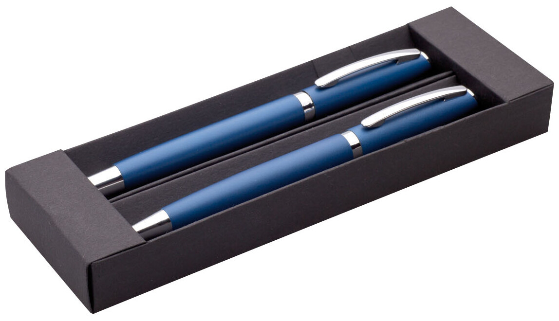 Dárková sada s modrou propiskou a rollerem v černé papírové krabičce.