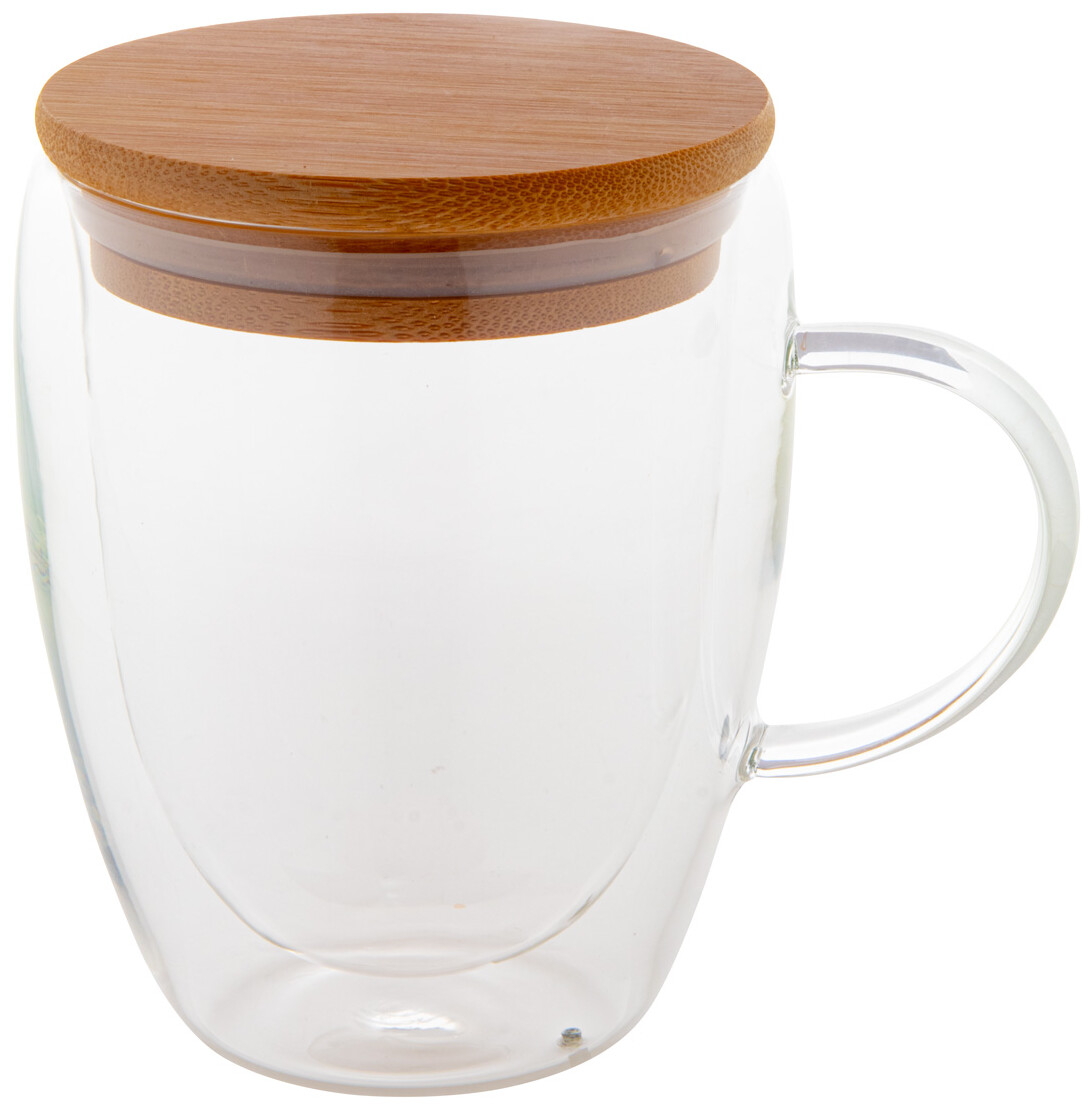 Dvoustěnný termohrnek z borosilikátového skla s uchem a bambusovým víčkem, 350 ml. V kraftové papírové krabici.