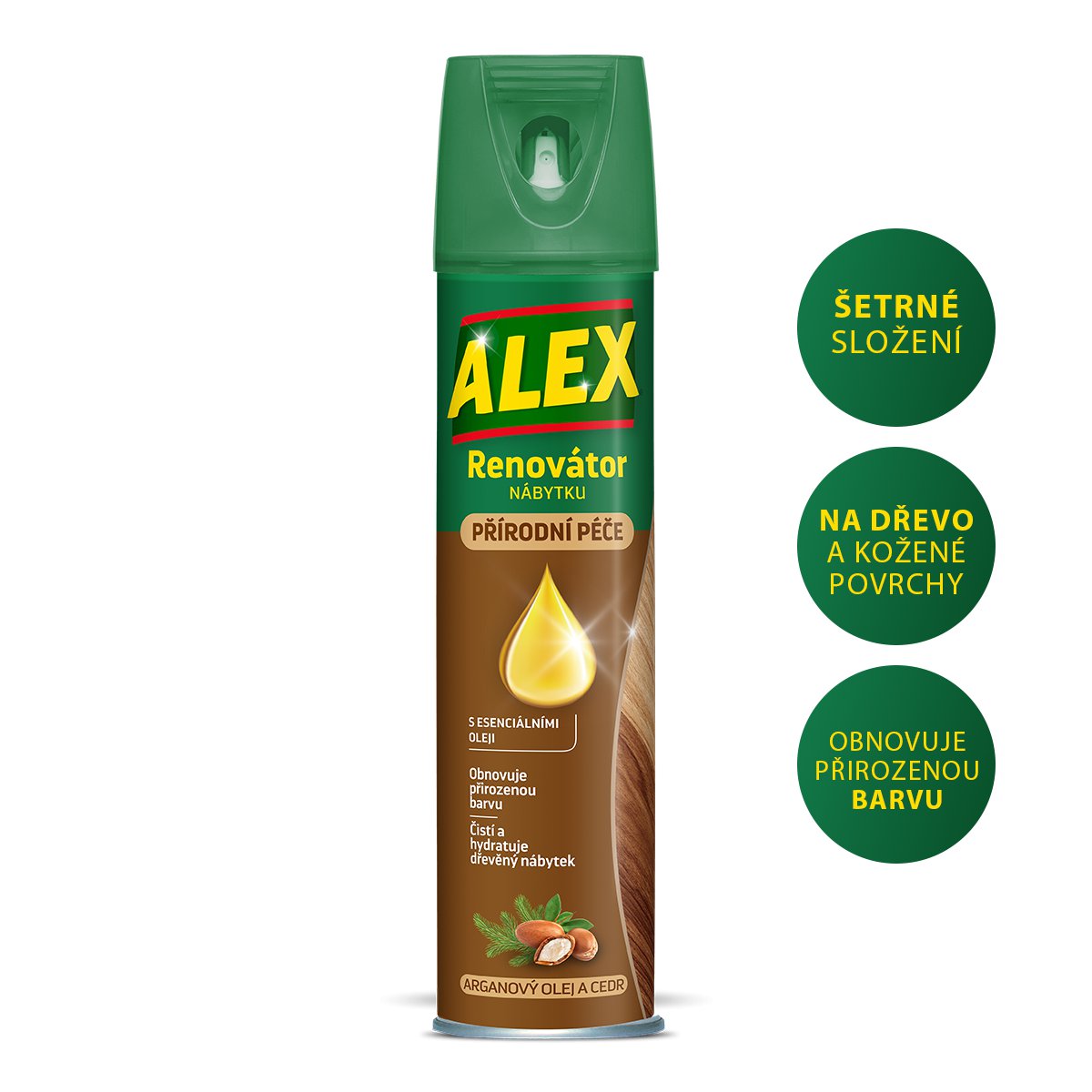 Alex sprej proti prachu s rychlým alkoholem čistí a ošetřuje veškeré druhy moderních ploch v domácnosti bez zanechání šmouh. Jeho exkluzivní složení odstraňuje nečistotu stejně jako prach. Zanechává příjemnou cedrovou vůni. Je určen pro všechny tvrdé plochy: matné, lesklé, omyvatelné, syntetické, lakované, z překližky, z plastů, zrcadla, obklady, může se použít i na vnější části televizorů, videí, DVD a dalších elektronických zařízení.