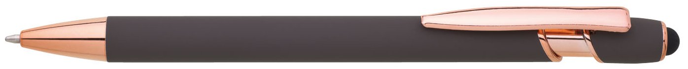 Kovová propiska se soft povrchem, touch koncovkou a doplňky v růžovo-zlaté barvě. Laserované logo je lesklé, růžovo-zlaté. Náplň modře píšící.