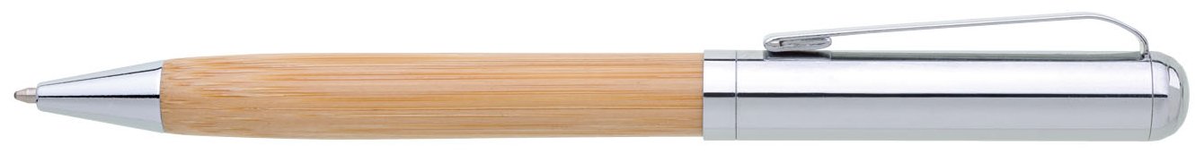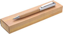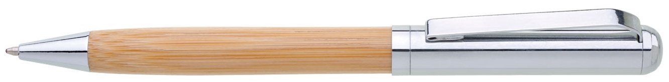 Otočná kovová propiska s bambusovou úchopovou částí. Součástí výrobku je papírová krabička.