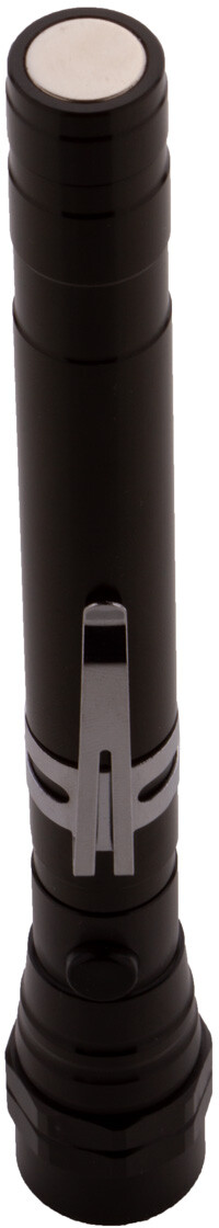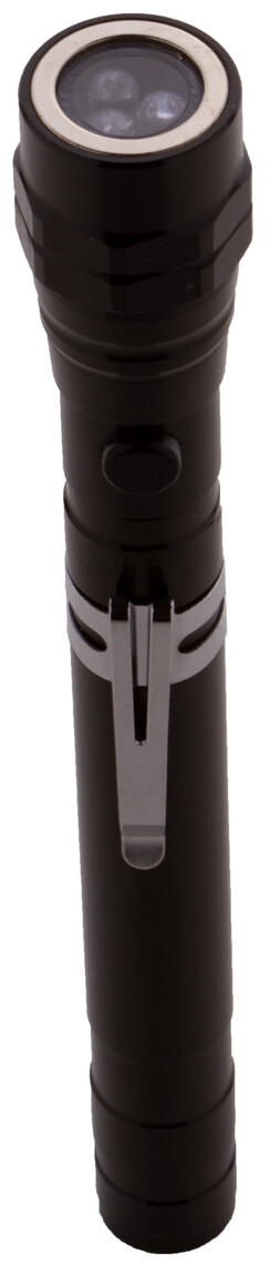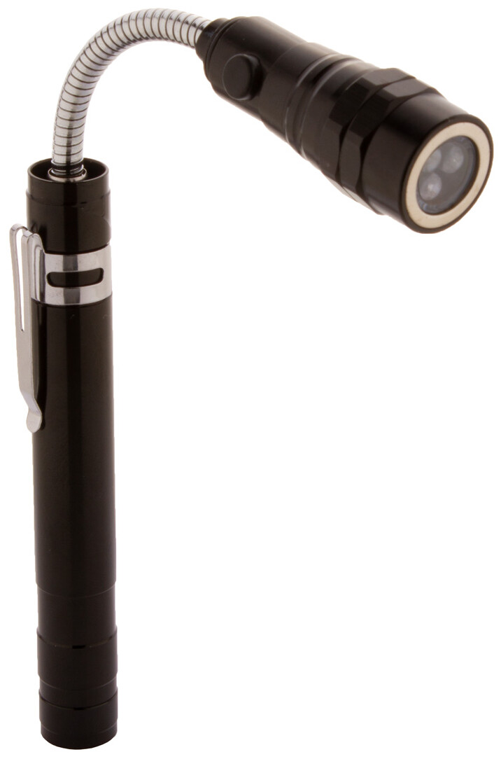 3 LED hliníková svítilna s výsuvnou a flexibilní hlavou, magnetem nahoře a kovovou boční sponou. Včetně knoflíkových baterií. Max. délka: 57 cm.