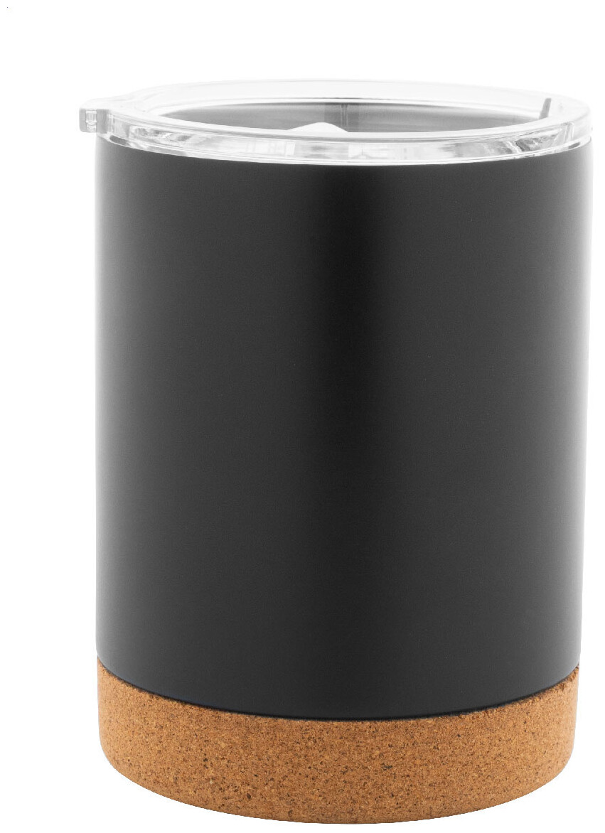 Dvoustěnný nerezový termohrnek s víčkem na pití a dnem z přírodního korku, 330 ml. V kraftové papírové krabici.
