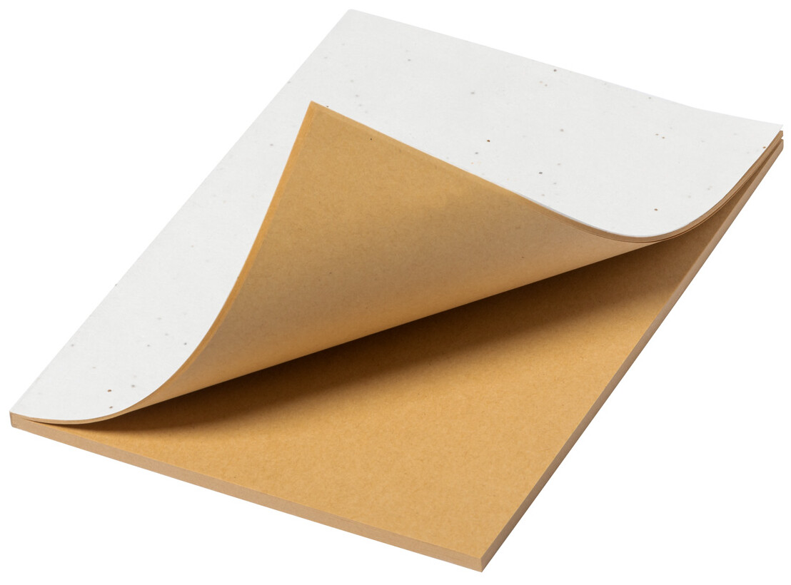Blok A5 z recyklovaného kraftového papíru potažený papírem se semínky se 60 čistými listy. Obal papíru se semínky obsahuje semena petúnie v různých barvách, která lze zasadit oddělením obalu od sešitu.