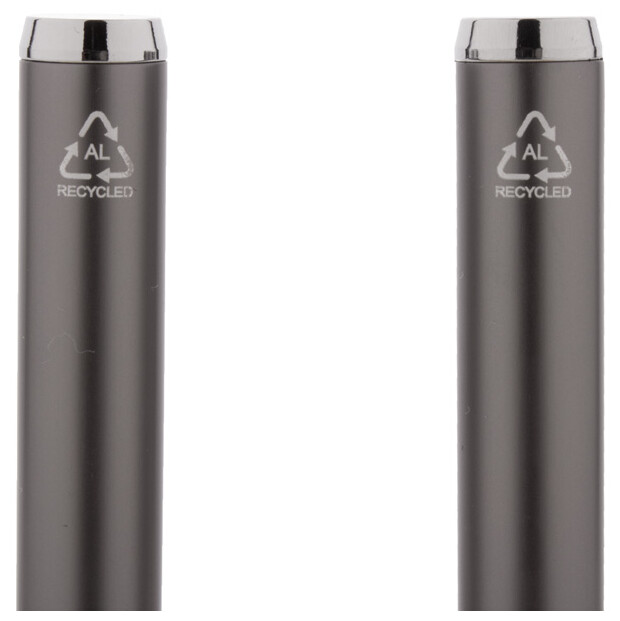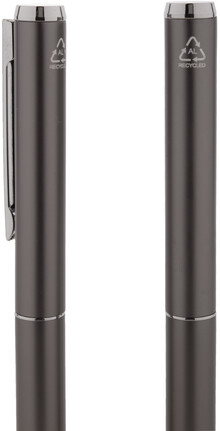 Sada pera z recyklovaného hliníku s rollerem a kuličkovým perem v černé papírové dárkové krabičce. S modrou náplní.