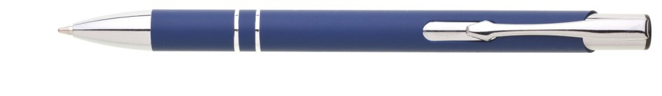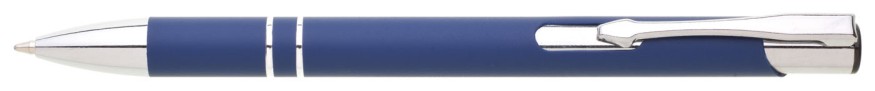 Hliníková propiska se stříbrnými doplňky a měkkým pogumovaným soft povrchem v modré barvě. Modře píšící.
