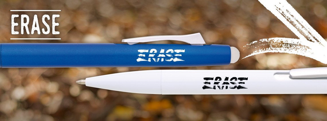 Gumovací plastová propiska v červené metalické barvě a stříbným klipem s koncovkou pro gumování napsaného textu. Náplň modrá, gumovací, s kratší životnosti než běžné kuličkové náplně.