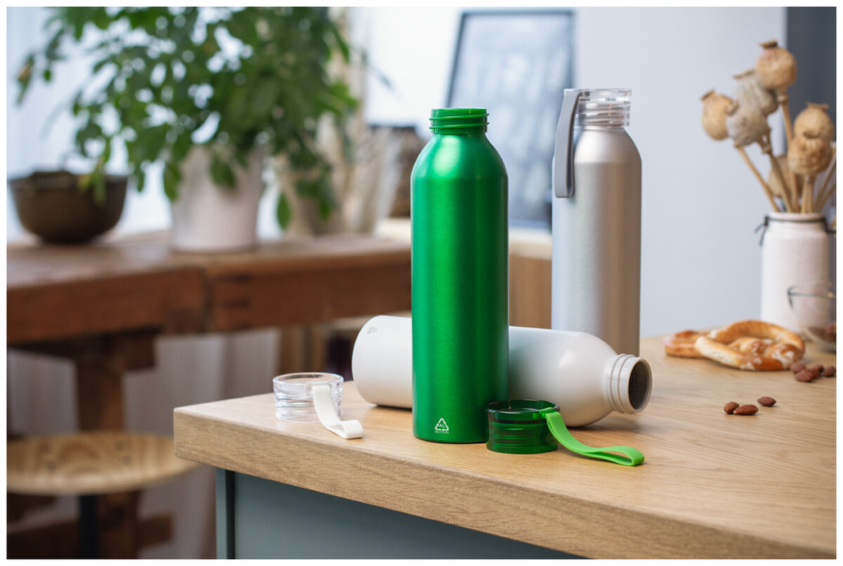 Láhev z recyklovaného hliníku s víčkem v odpovídající barvě a silikonovým popruhem, 600 ml.