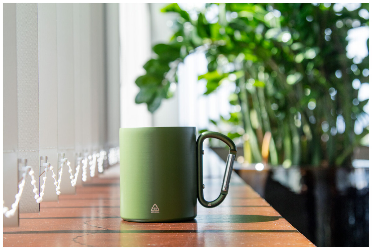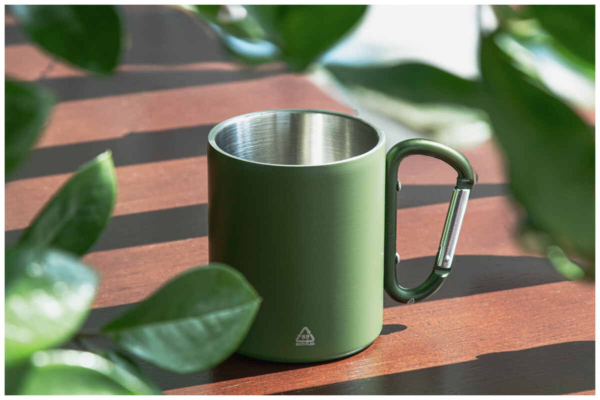 Dvoustěnný termo hrnek z recyklované nerezové oceli s karabinou z recyklovaného hliníku v odpovídající barvě. 300 ml. V kraftové papírové krabici.