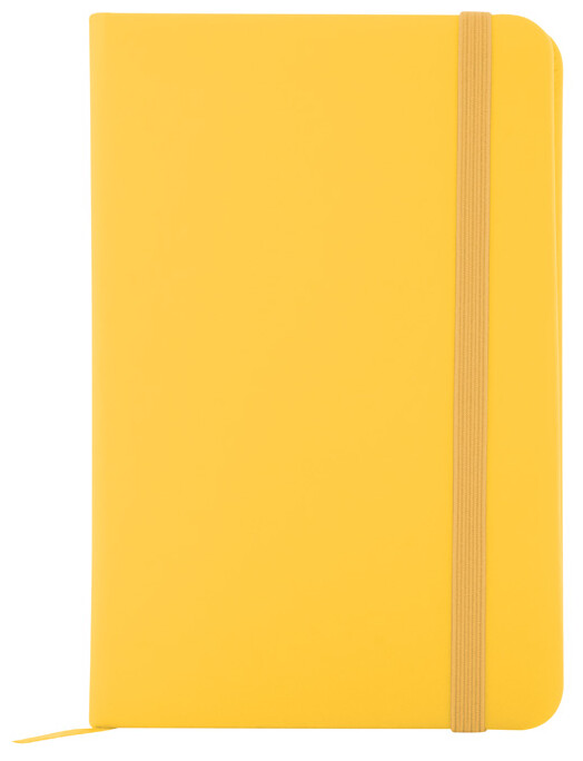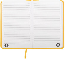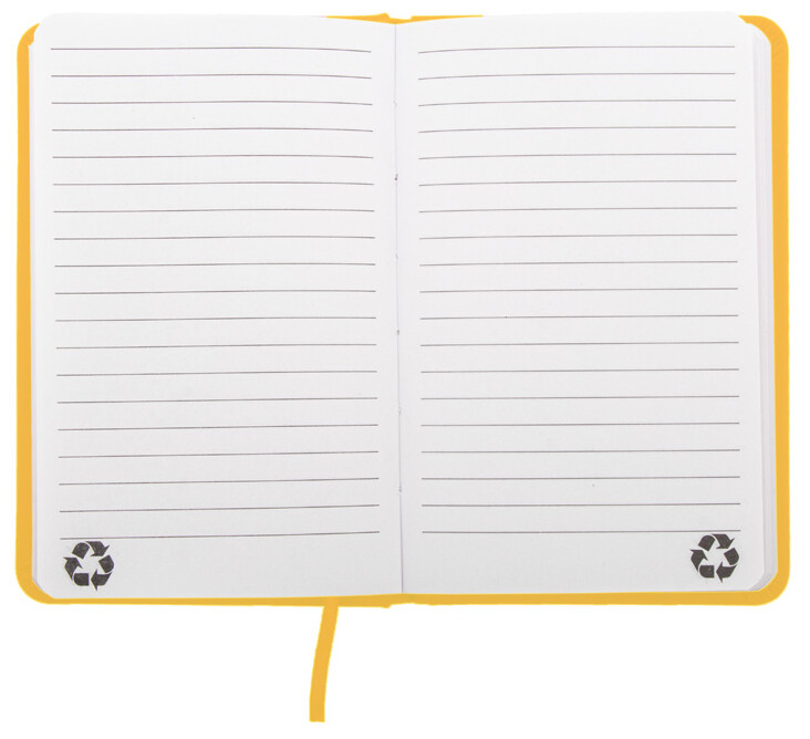 Blok potažený recyklovanou PU kůží se 100 linkovanými listy z recyklovaného papíru. Se záložkou v odpovídající barvě a gumičkou. Velikost A6.