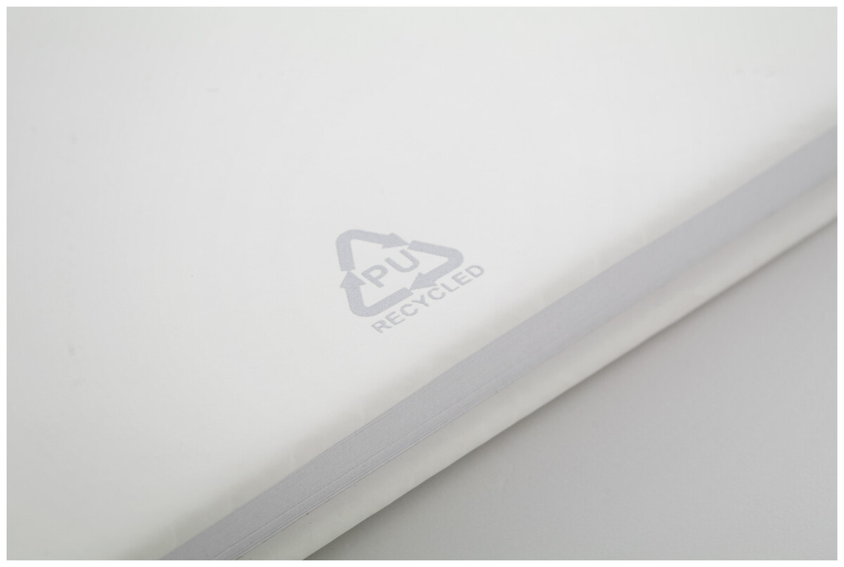 Blok potažený recyklovanou PU kůží se 100 linkovanými listy z recyklovaného papíru. Se záložkou v odpovídající barvě a gumičkou. Velikost A6.