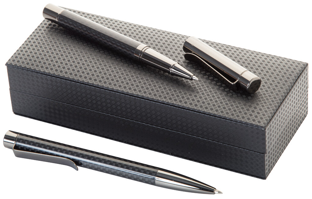 Elegantní, kovová sada kuličkového pera a rolleru s karbonovým vzorovaným tubusem a díly z červeného kovu. V dárkové krabičce s karbonovým vzorem, s modrou náplní.