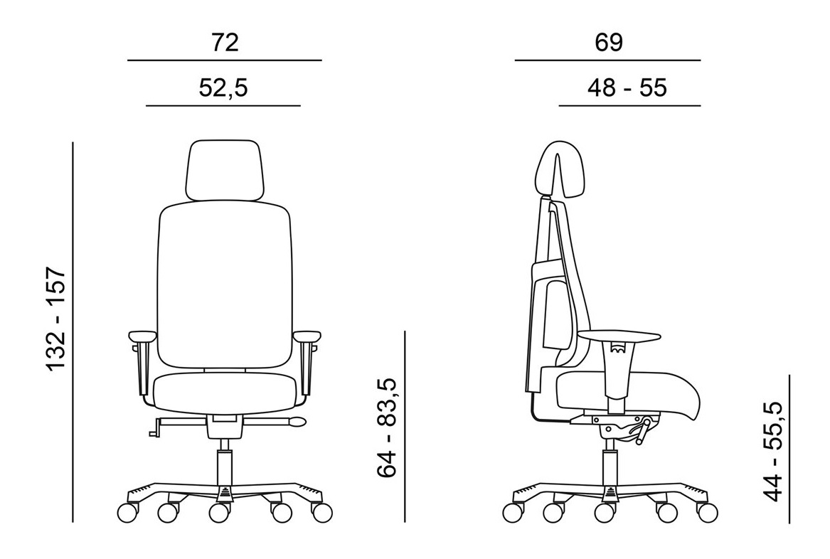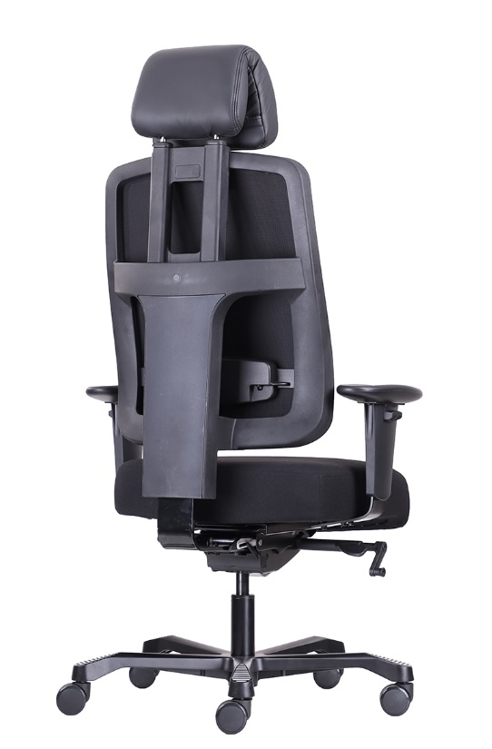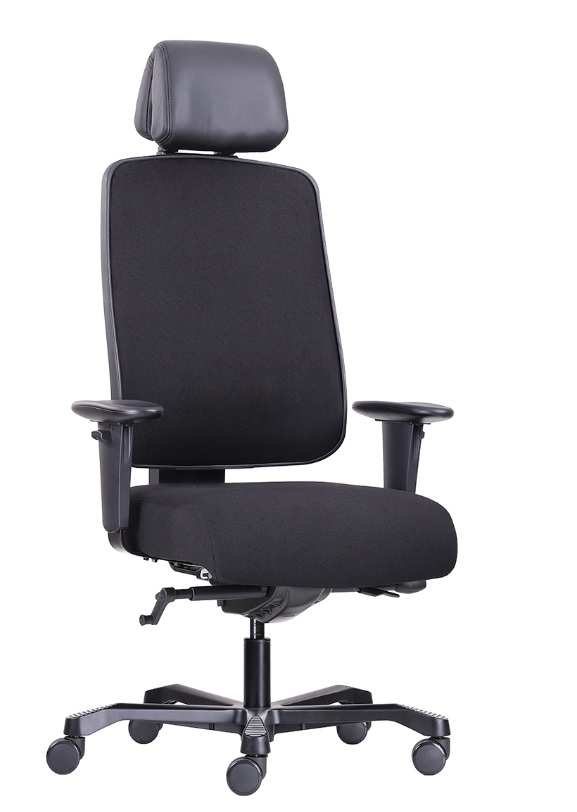 křeslo pro vysoké a těžké postavy s aplikací 24/7 – extra vysoký síťovaný opěrák potažený látkou a podhlavník z hovězí usně, vysoký čaloun sedáku 130 mm, pěna s vysokou odolností, synchronní mechanika s pětinásobnou aretací nastavení síly protiváhy v rozpětí hmotnosti 60-200 kg, bederní výztuha s výškovým nastavením, nastavení výšky opěradla, výškově nastavitelné područky s měkkou dotykovou plochou, nastavení výšky sedu plynovým pístem class 4, mechanismus pro nastavení hloubky sedáku, kolečka s gumovou obručí, ALU kříž lakovaný černý, určená pro vícesměnné provozy, nosnost 200 kg (certifikace TÜV Rheinland), záruka 60 měsíců