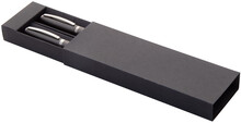 Sada per z recyklovaného hliníku s rollerem a kuličkovým perem v černé papírové dárkové krabičce. S modrou náplní.