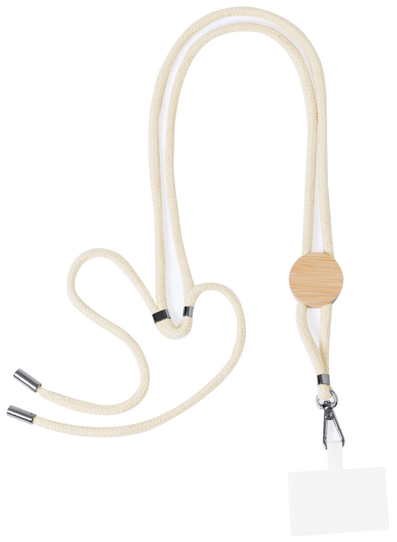 Bavlněný lanyard s nastavitelnou délkou, s držákem na mobil s bambusovým štítkem, vložkou na telefon a kovovou karabinou.