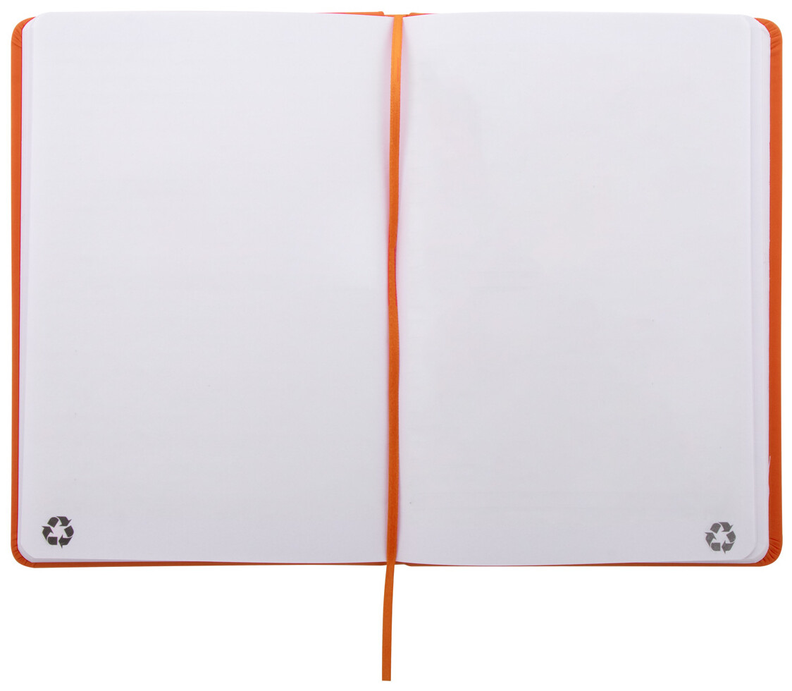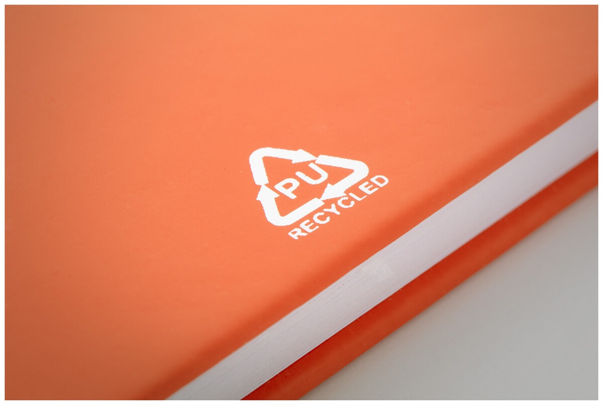 Blok A5 z recyklované PU kůže se 100 čistými listy z recyklovaného papíru. Se záložkou v odpovídající barvě a gumičkou.