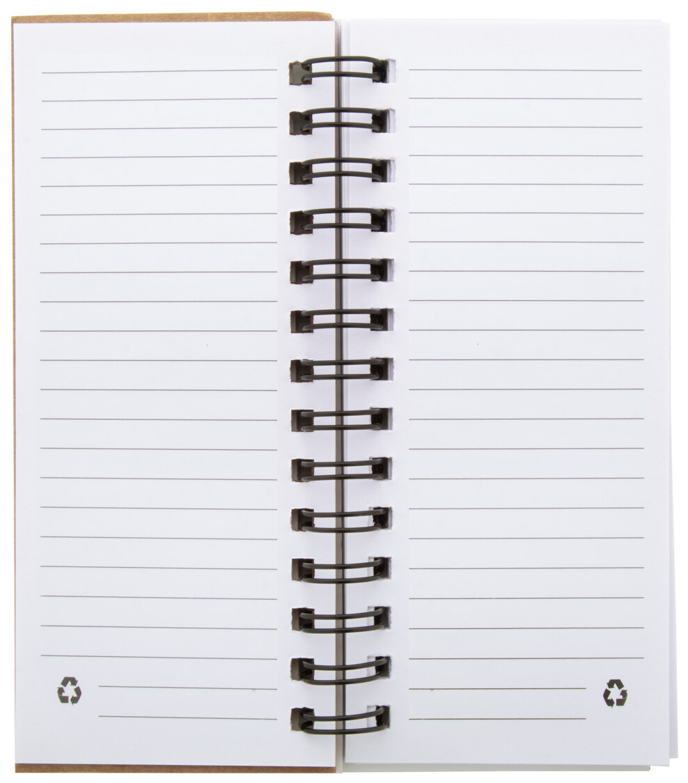 Spirálový blok potažený plstí RPET se 40 linkovanými listy z recyklovaného papíru, 25 lepicími papírky a 125 značkami stránek (v 5 různých barvách).