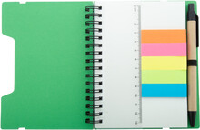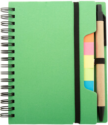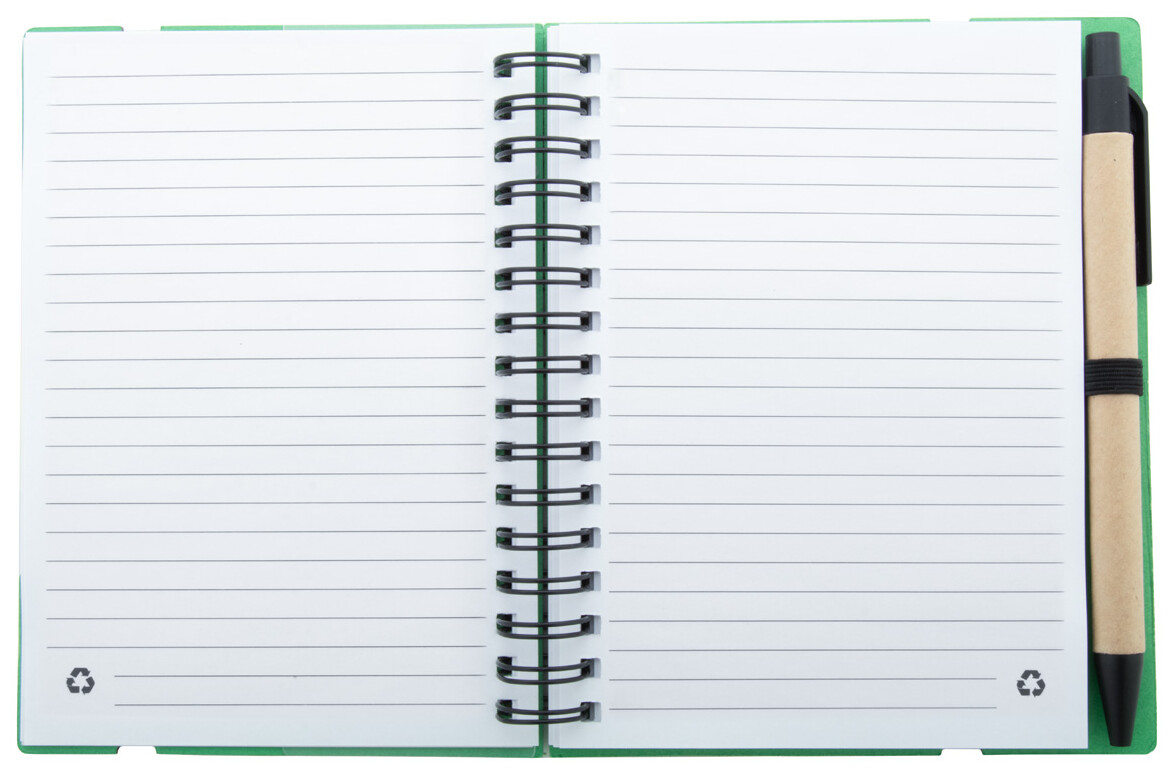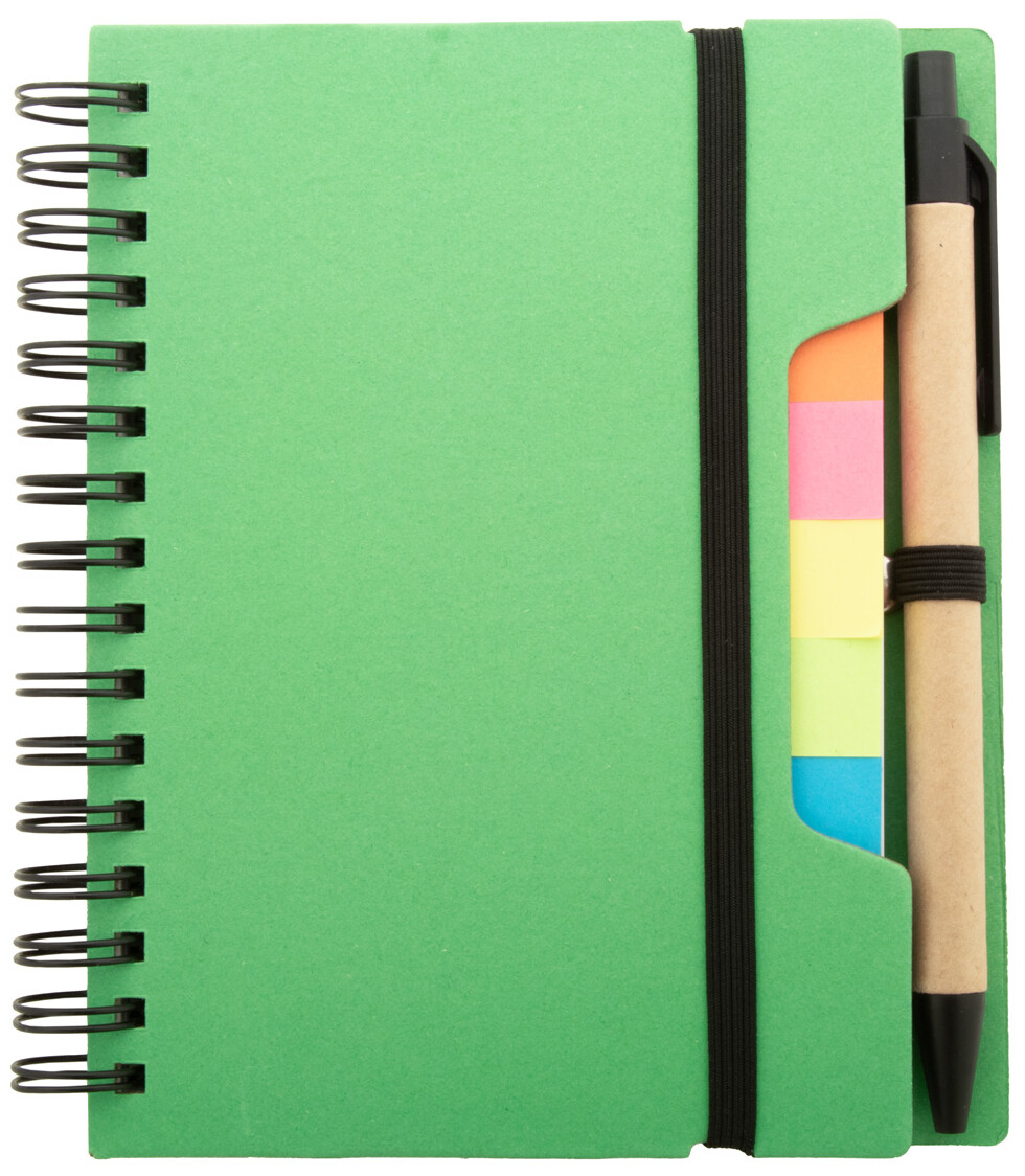 Spirálový blok A6 z recyklovaného papíru se 70 linkovanými listy a 125 popisovači stránek (v 5 různých barvách). S gumovým páskem a držákem na pero. Včetně kuličkového pera z recyklovaného papíru s modrou náplní.