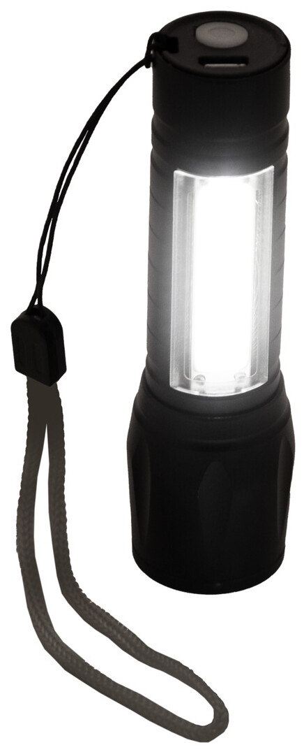 Hliníková baterka s vestavěnou USB dobíjecí baterií (400 mAh) a popruhem na přenášení. Se zoomovatelným vysoce výkonným COB světlem u písma a COB světlometem na boku. S pevným a blikajícím režimem světla. Včetně USB nabíjecího kabelu.