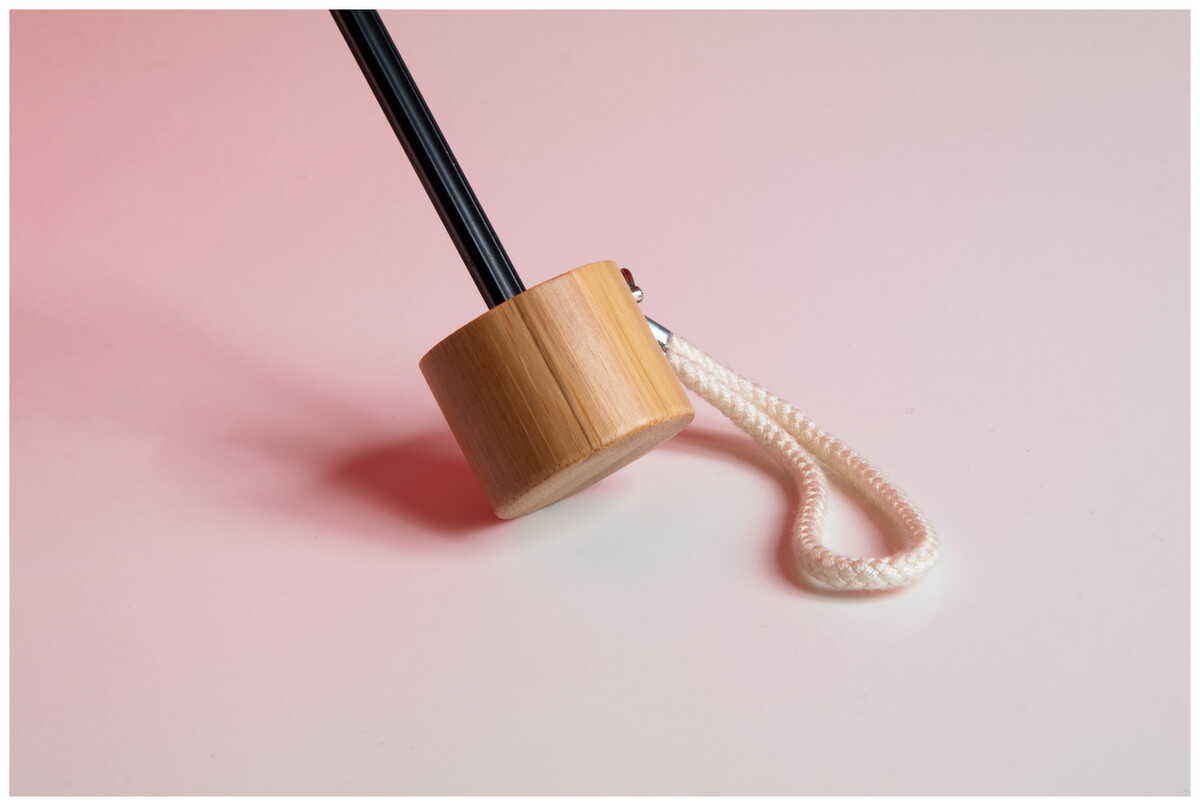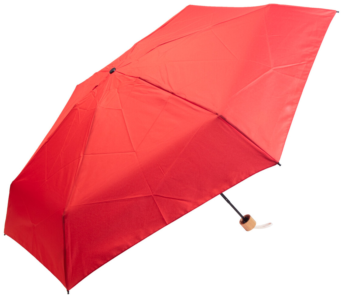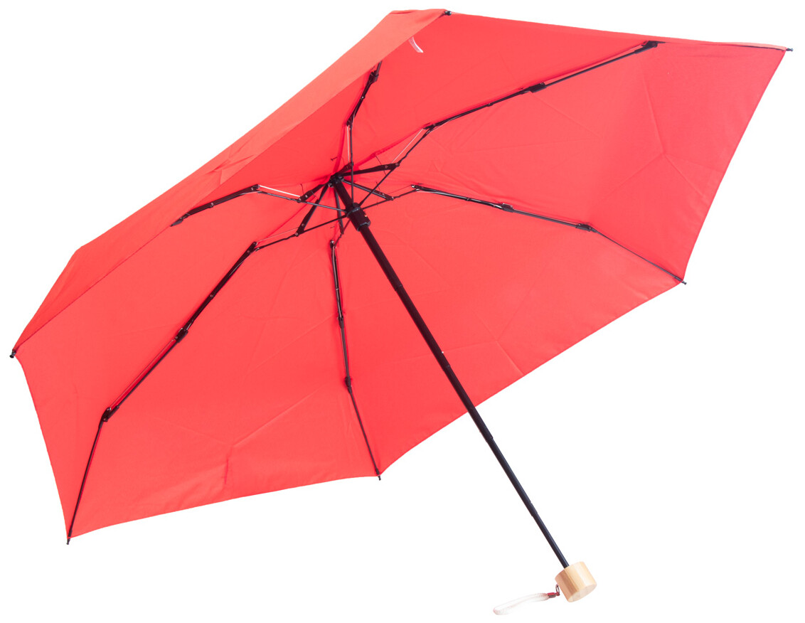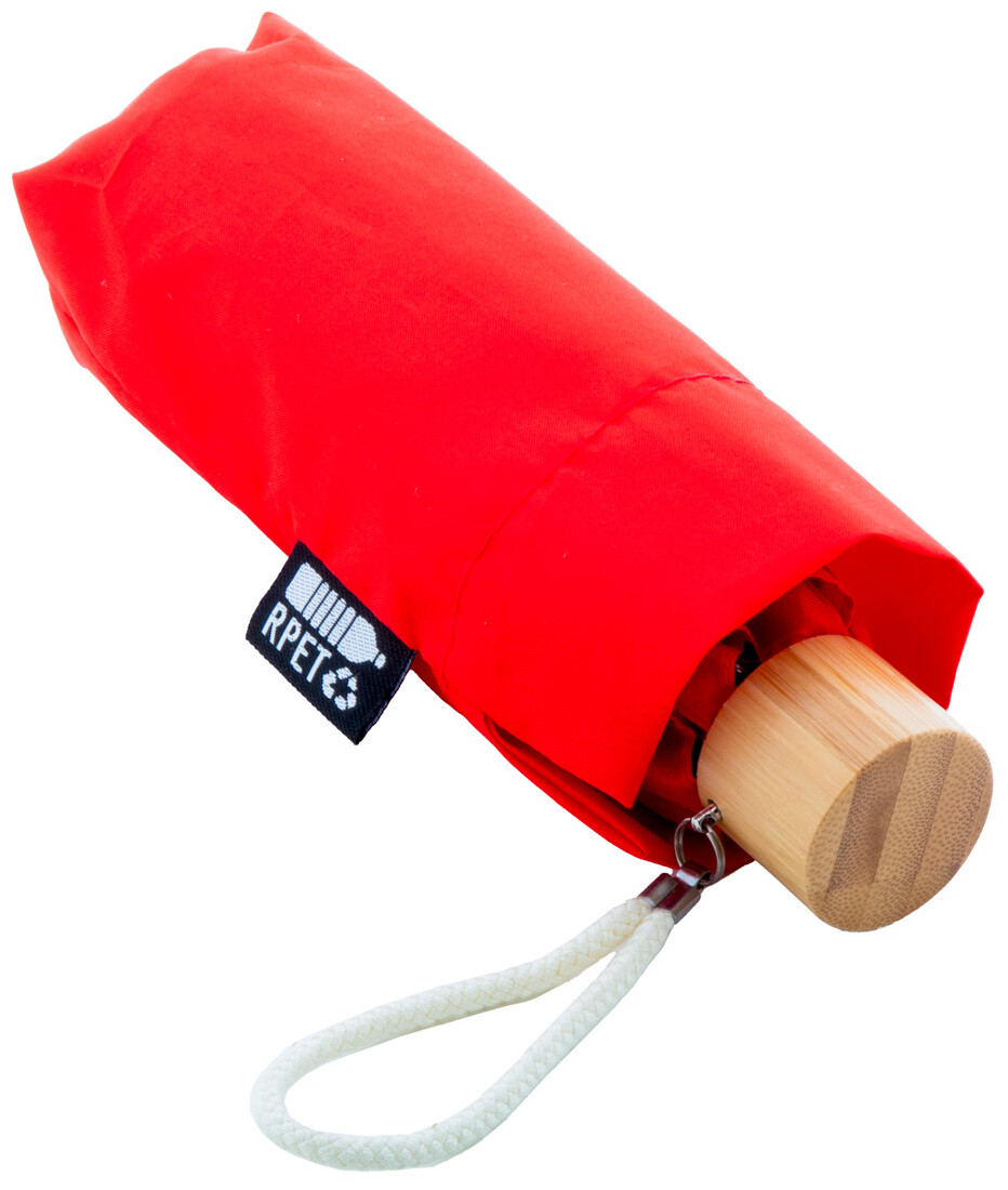 Manuální, větruodolný 3-skládací mini deštník s 6 panely v pouzdru v odpovídající barvě. S kovovým rámem, sklolaminátovými žebry, bambusovou rukojetí a bavlněným poutkem na ruku. 190T RPET pongee, s výrazným štítkem RPET.