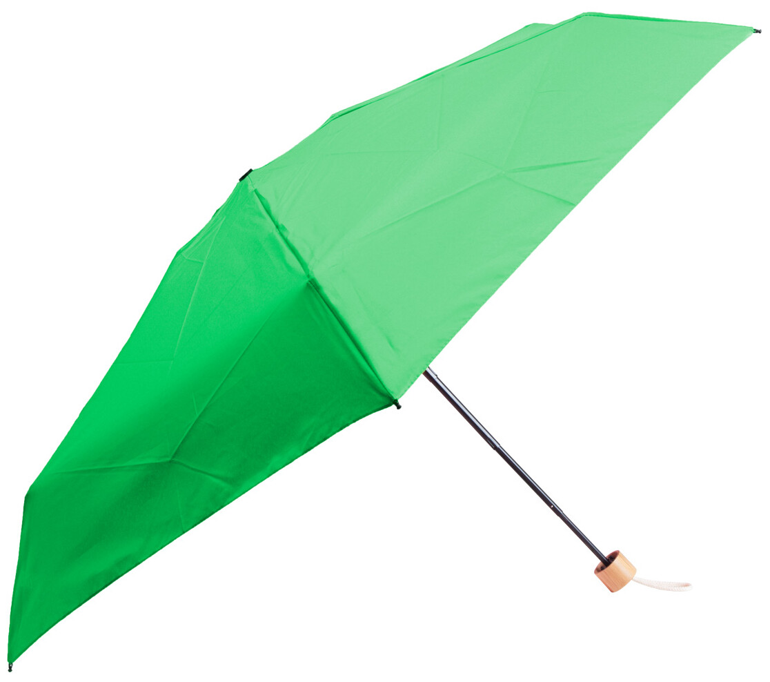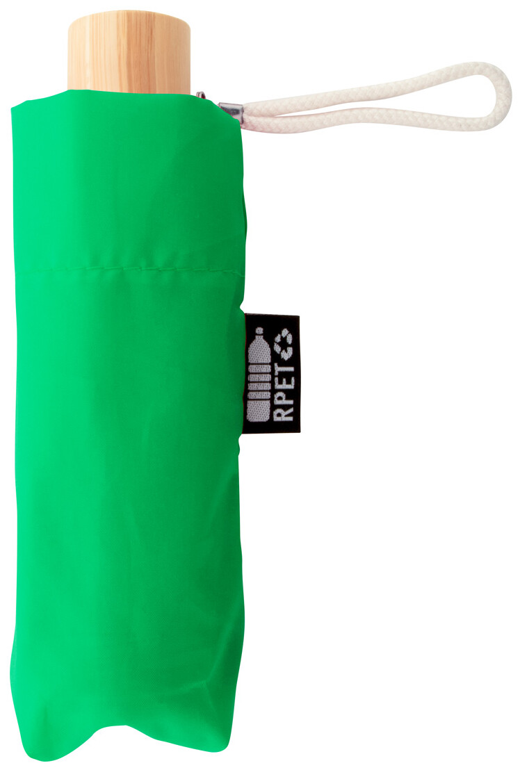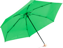 Manuální, větruodolný 3-skládací mini deštník s 6 panely v pouzdru v odpovídající barvě. S kovovým rámem, sklolaminátovými žebry, bambusovou rukojetí a bavlněným poutkem na ruku. 190T RPET pongee, s výrazným štítkem RPET.