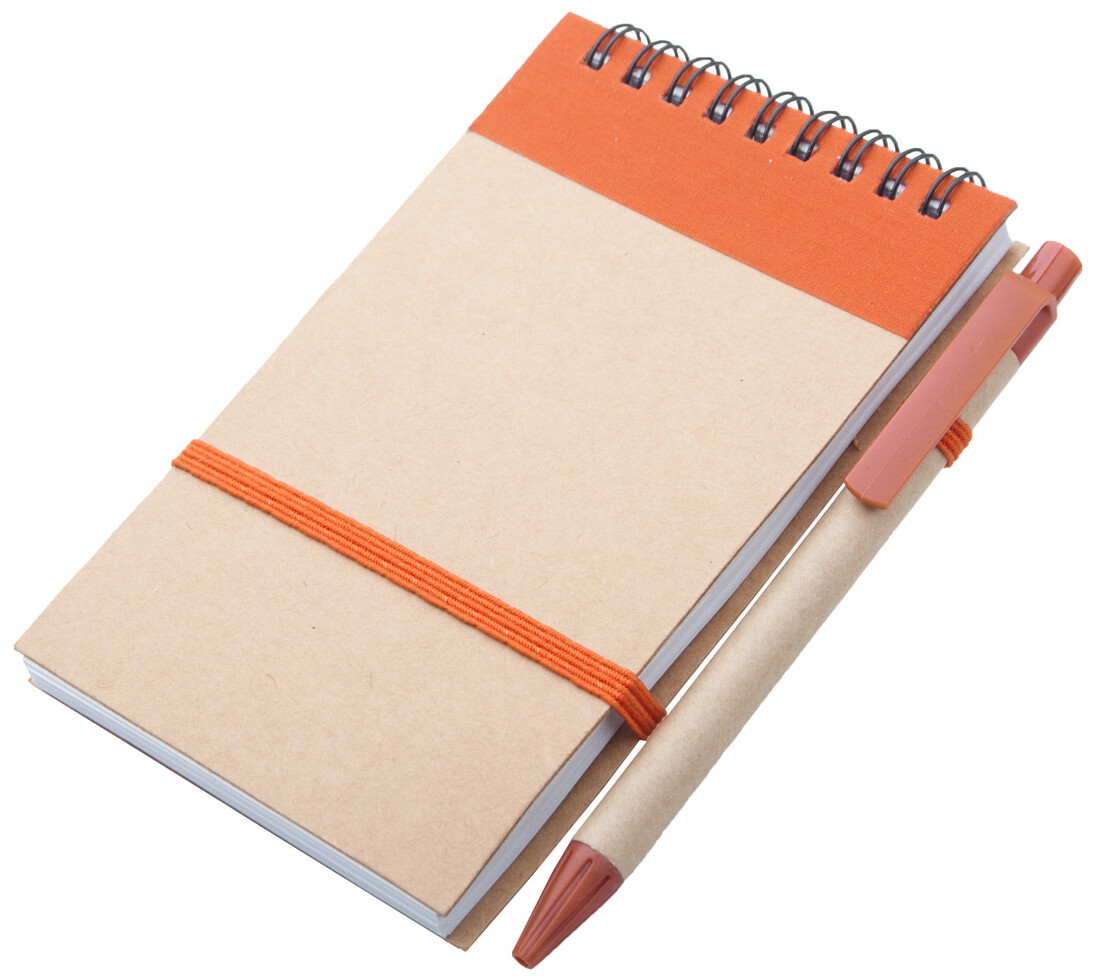 Blok ve spirále z recyklovaného papíru se 70 linkovanými listy a kuličkovým perem z recyklovaného papíru s modrou náplní. Velikost A6.