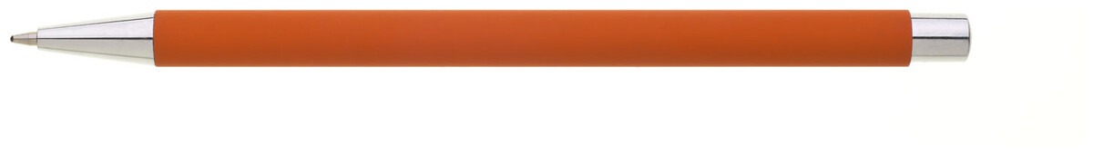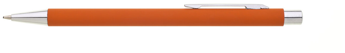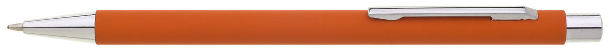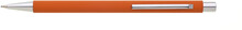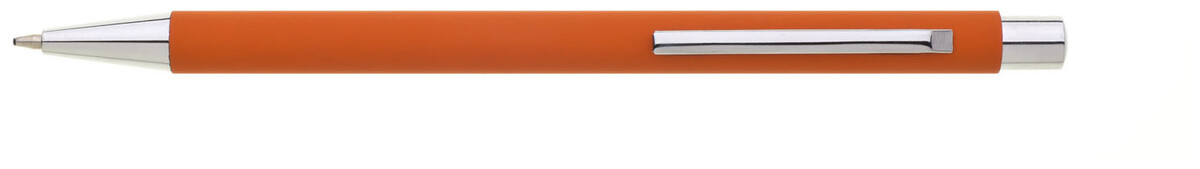 Tenká, jednoduchá propiska s oranžovým pogumovaným tělem a chromovými doplňky. Náplň X20, modře píšící.