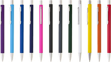 Tenká, jednoduchá propiska s fialovým pogumovaným tělem a chromovými doplňky. Náplň X20, modře píšící.