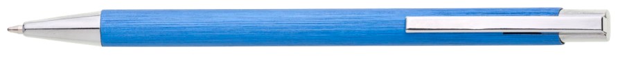 Modrá kovová propiska s jemně rýhovaným povrchem.