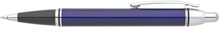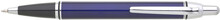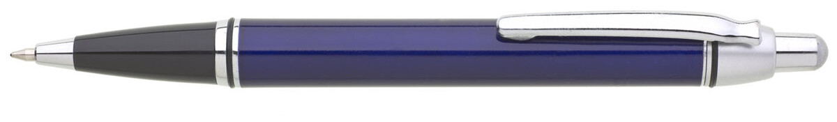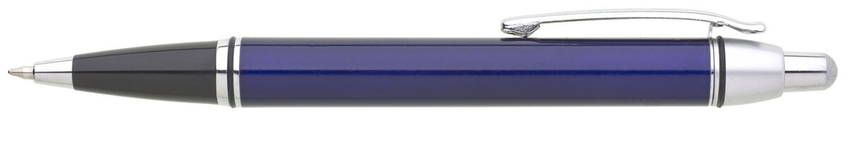Modrá metalická propiska je doplněna černou špičkou a stříbrnými doplňky. Náplň velkoobsahová, modře píšící.