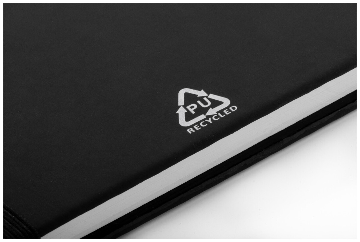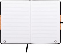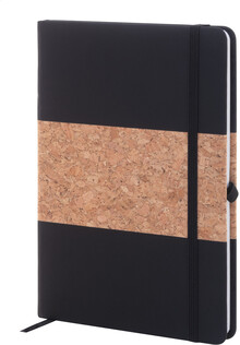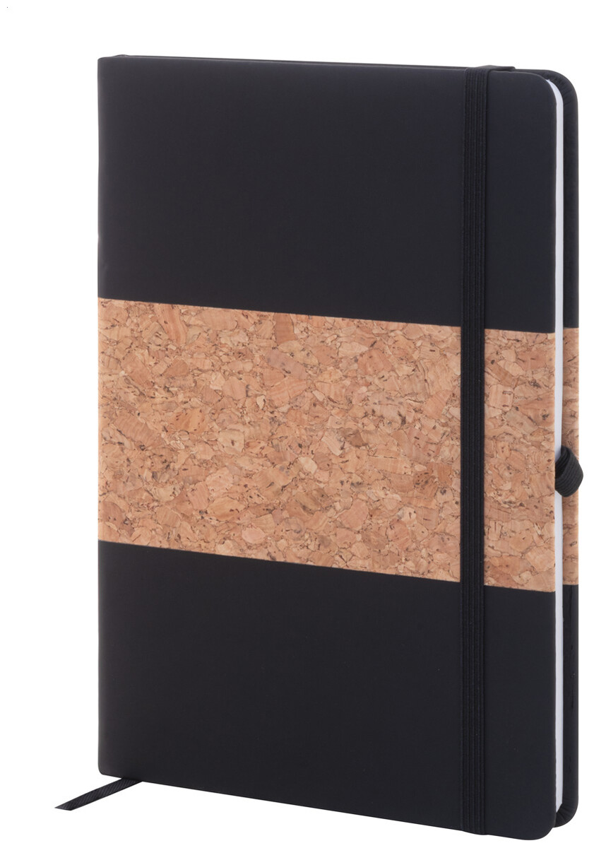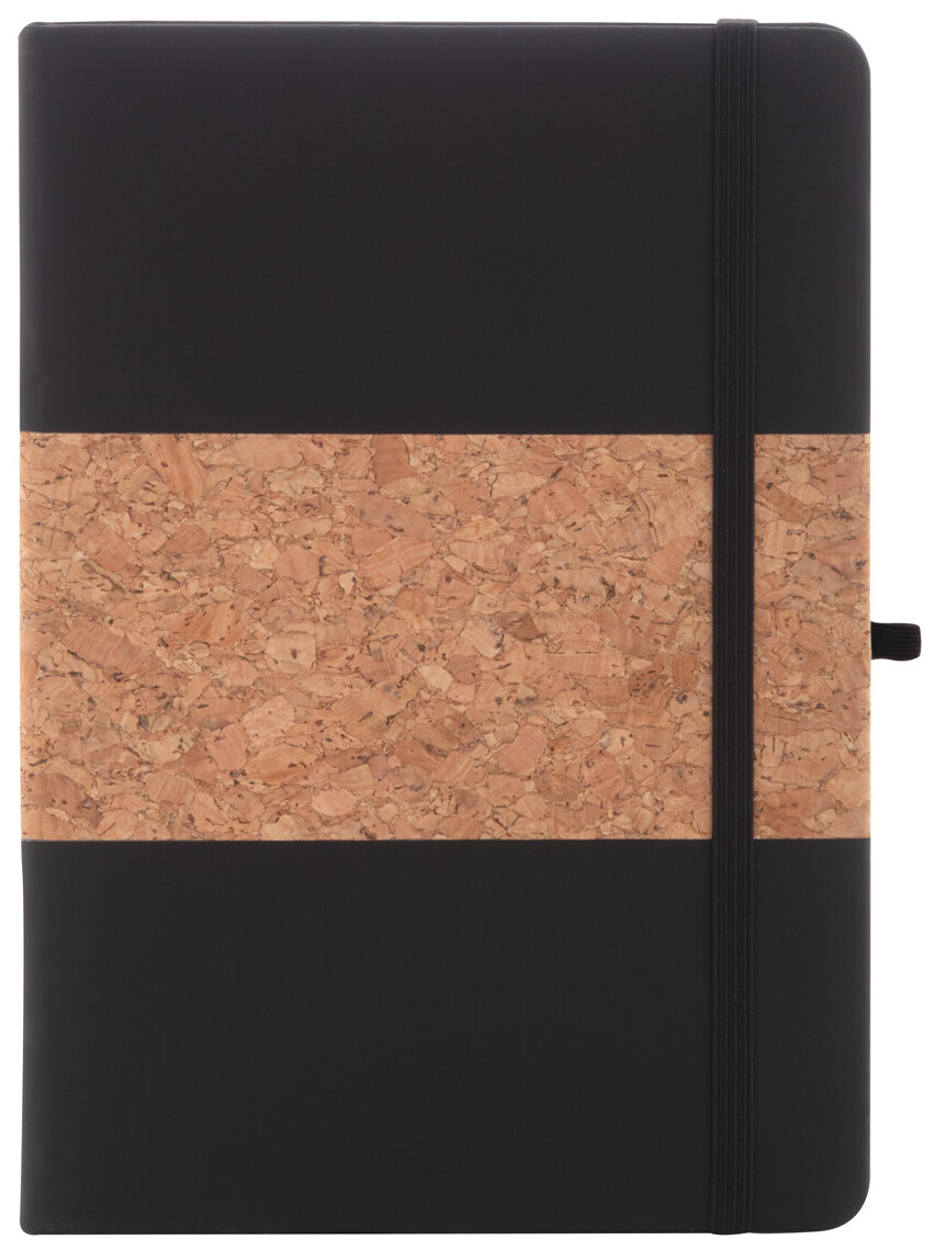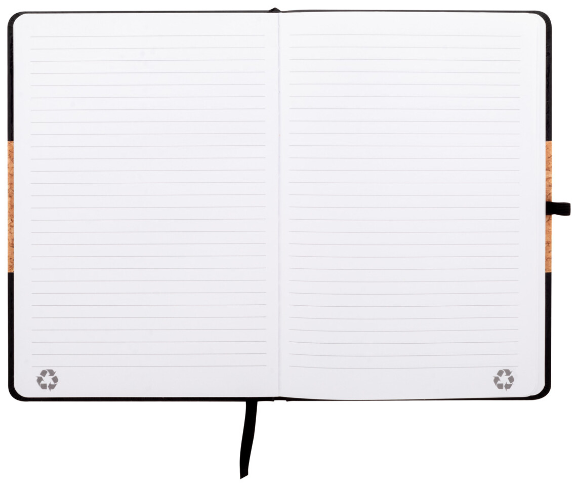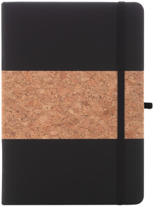 Blok A5 potažený přírodním korkem a recyklovanou PU kůží se záložkou v odpovídající barvě, gumičkou a držákem na pero. S 80 linkovanými listy z recyklovaného papíru.