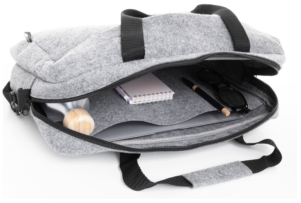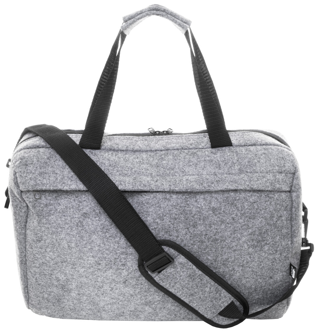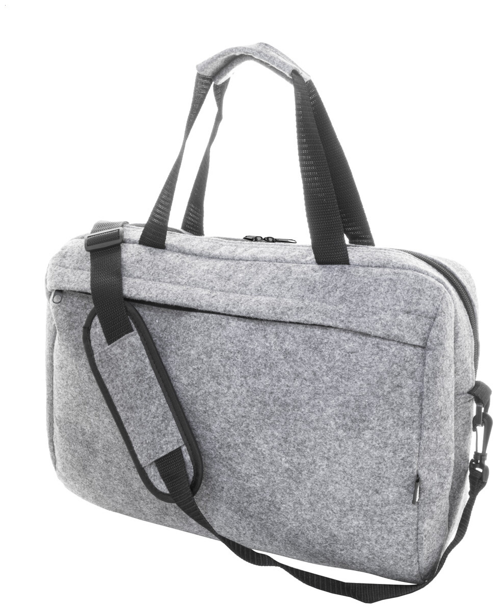 Taška na dokumenty z RPET plsti s hlavní přihrádkou na zip a přední kapsou. S přihrádkou na notebook (15"), popruhem na vozík a nastavitelným ramenním popruhem. S výrazným štítkem RPET.