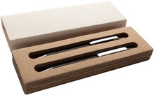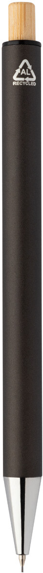 Sada pera z recyklovaného hliníku s kuličkovým perem a mechanickou tužkou s bambusovými knoflíky. S modrou náplní a 0,7 mm tuhy. V kraftové papírové krabici.