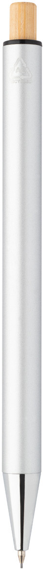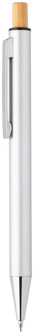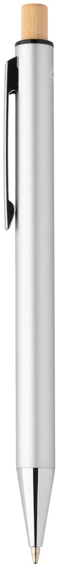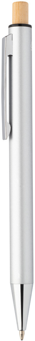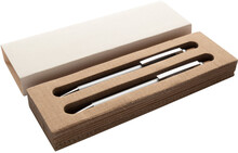 Sada pera z recyklovaného hliníku s kuličkovým perem a mechanickou tužkou s bambusovými knoflíky. S modrou náplní a 0,7 mm tuhy. V kraftové papírové krabici.