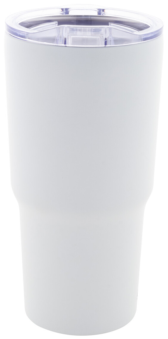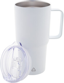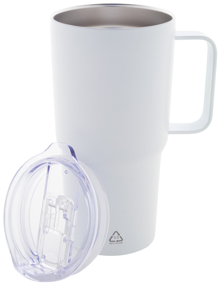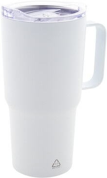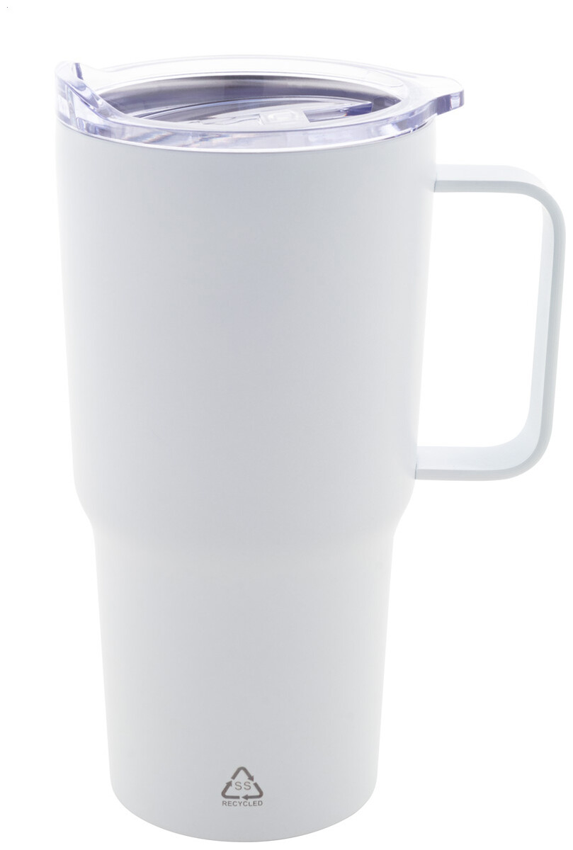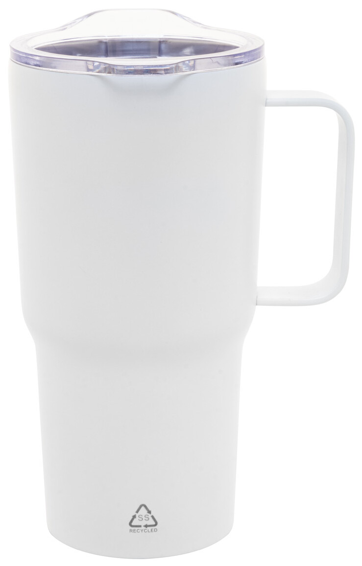 Dvoustěnný vakuově izolovaný termo hrnek z recyklované nerezové oceli s plastovým víčkem na pití z PS. 600 ml.