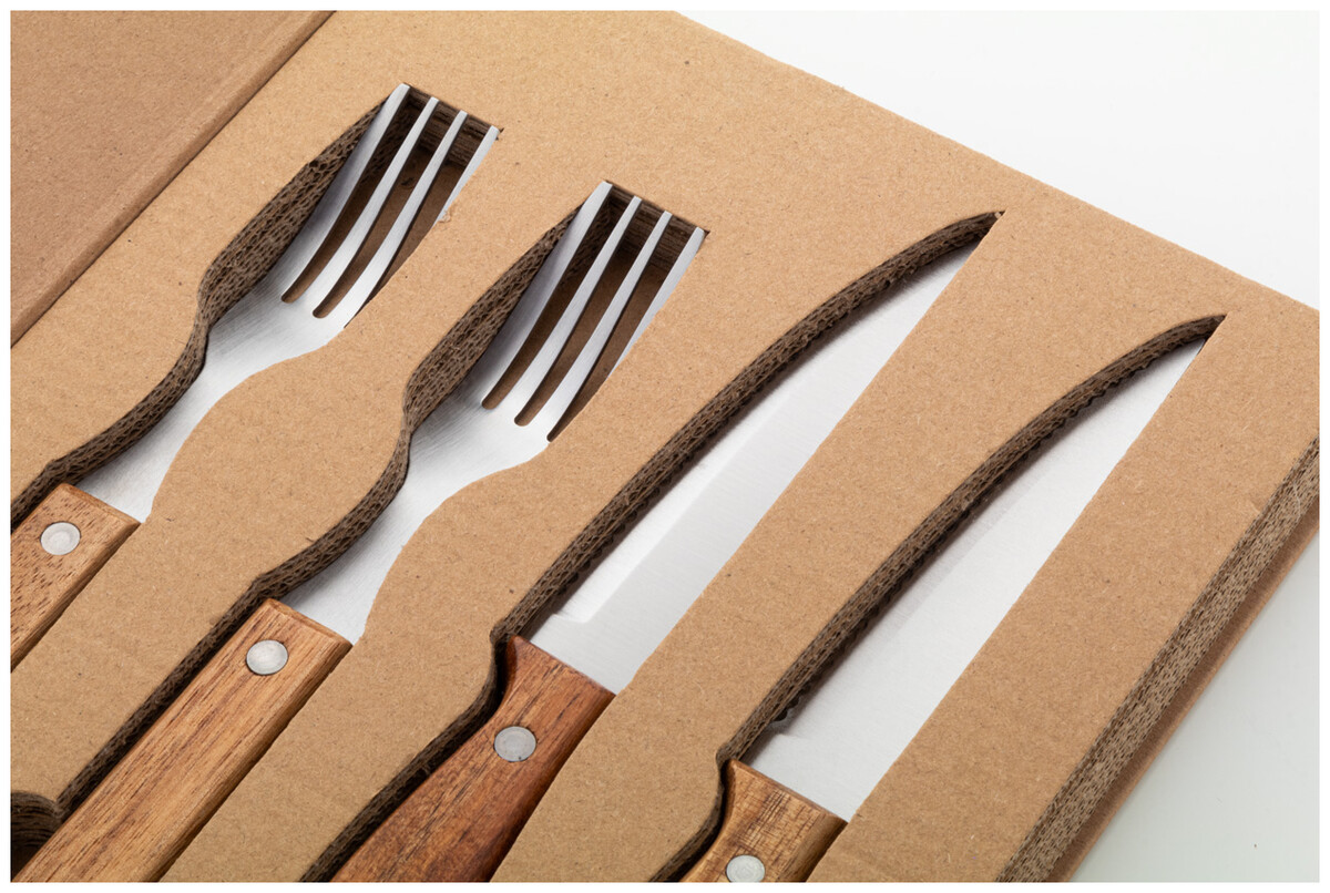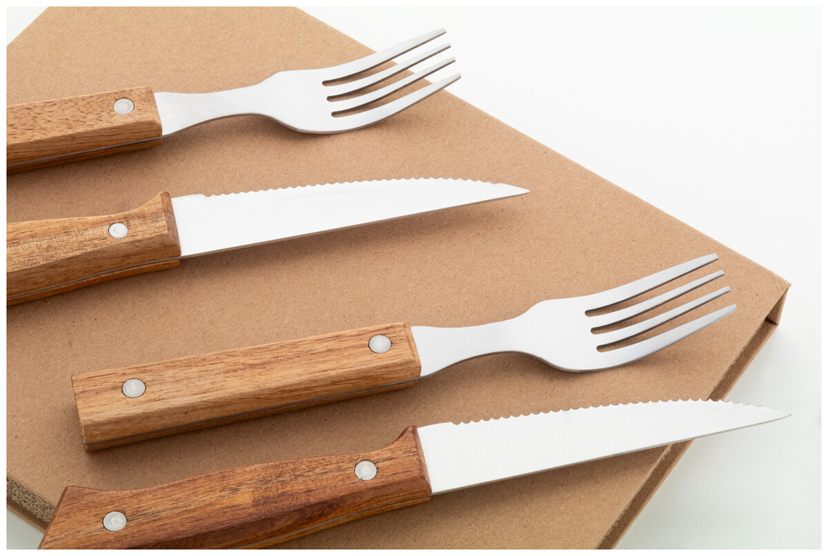 4dílná sada steakových příborů z nerezové oceli s rukojetí z akáciového dřeva (2 steakové nože, 2 vidličky). V krabičce ve tvaru knihy z kraftového papíru.