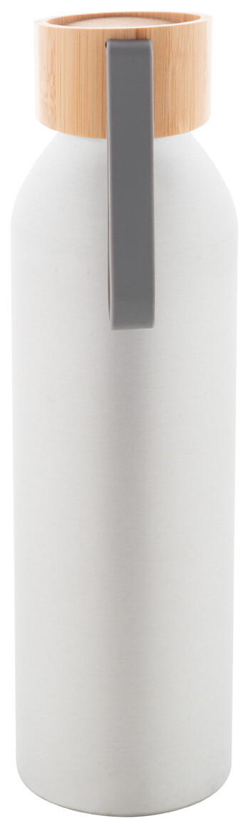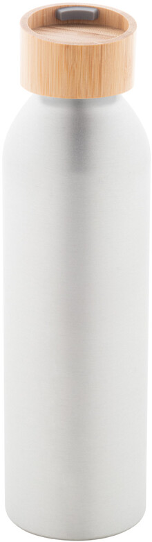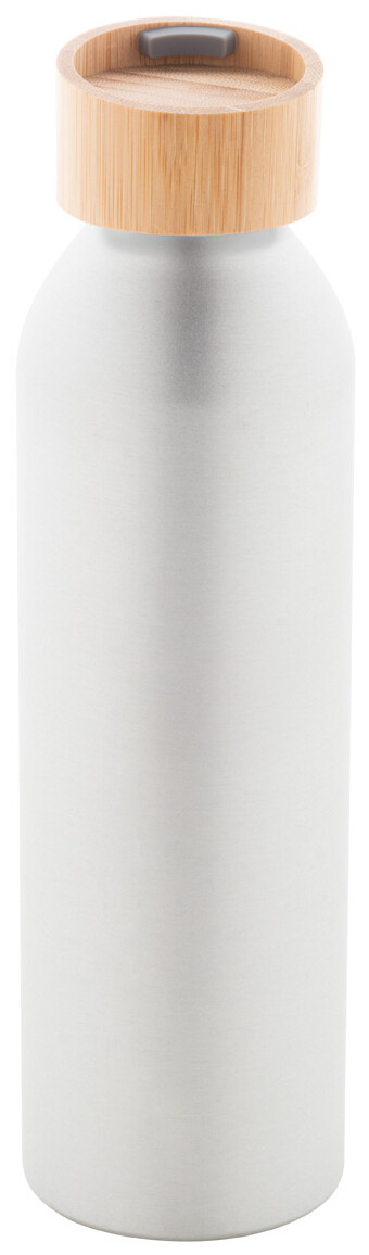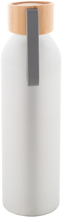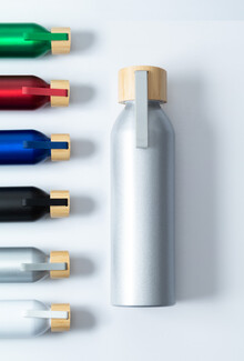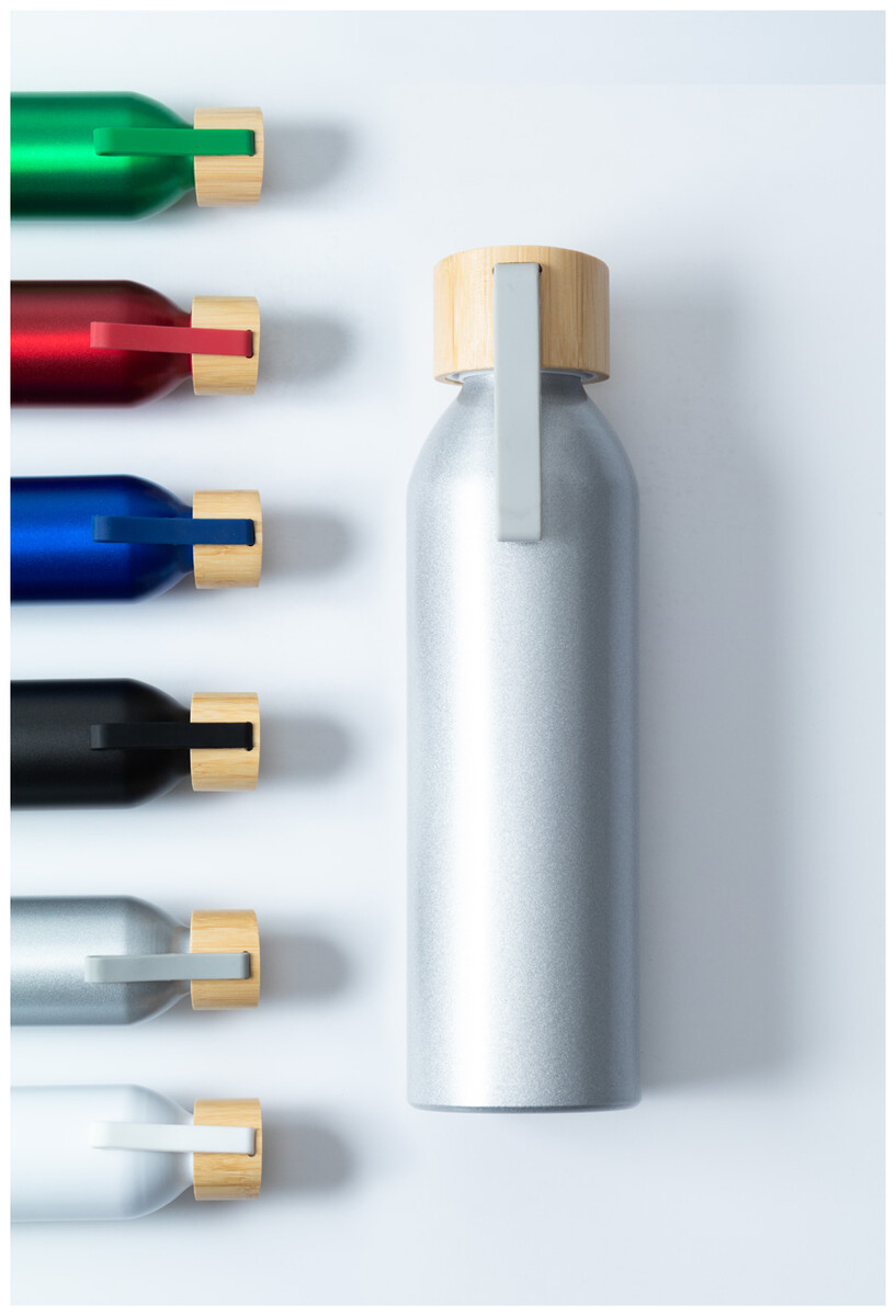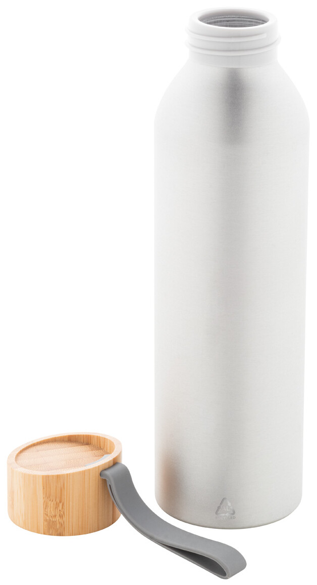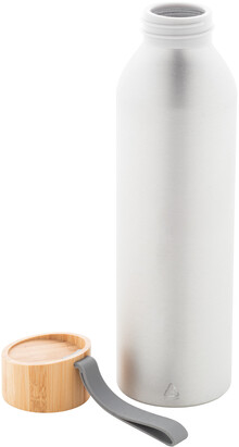 Láhev z recyklovaného hliníku s bambusovým víčkem a silikonovým popruhem v odpovídající barvě, 600 ml.