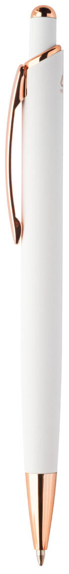 Kuličkové pero z recyklovaného hliníku s pogumovaným povrchem a detaily z růžového zlata. Se speciální povrchovou úpravou pro zrcadlové laserové gravírování v barvě růžového zlata. S modrou náplní.