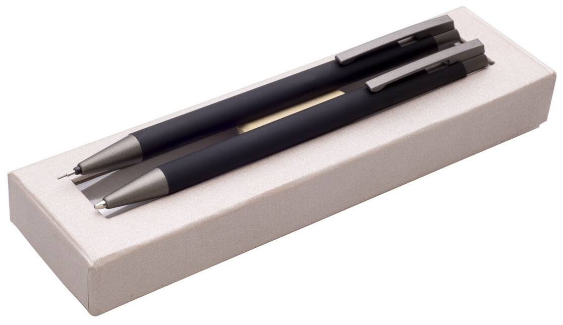 Dárková sada černé propisky a mikrotužky s pogumovaným povrchem a šedými doplňky v luxusním dárkovém pouzdru s průhledným okénkem.