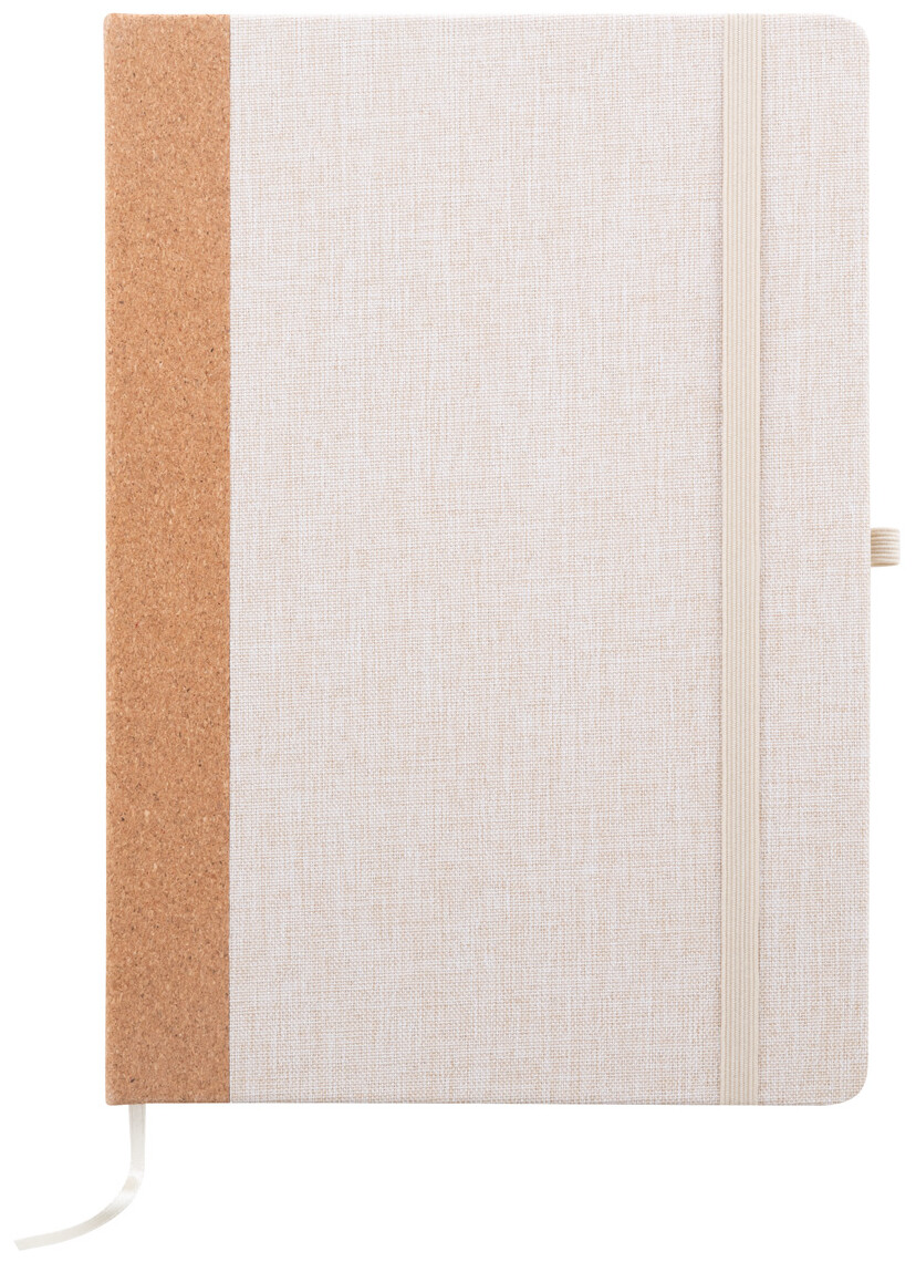 Blok A5 potažený polyesterem RPET s hřbetem z přírodního korku a 80 linkovanými listy z recyklovaného papíru. Se záložkou, gumovým páskem a držákem na pero.