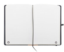 Blok A5 potažený polyesterem RPET s hřbetem z přírodního korku a 80 linkovanými listy z recyklovaného papíru. Se záložkou, gumovým páskem a držákem na pero.