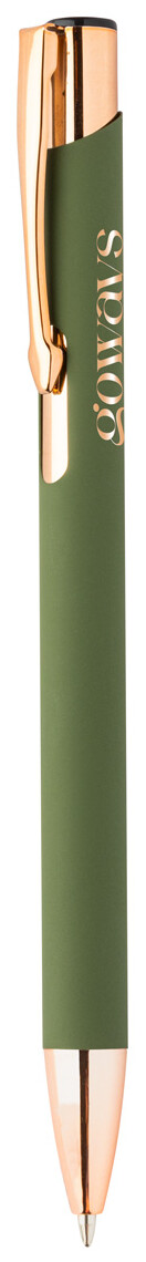 Kuličkové pero z recyklovaného hliníku s pogumovaným povrchem a detaily v barvě růžového zlata. Se speciální povrchovou úpravou pro zrcadlové laserové gravírování v barvě růžového zlata. S modrou náplní.