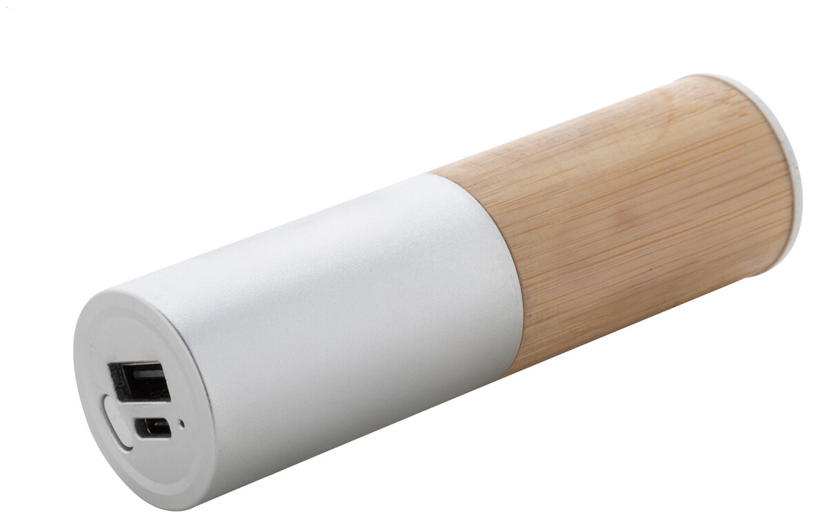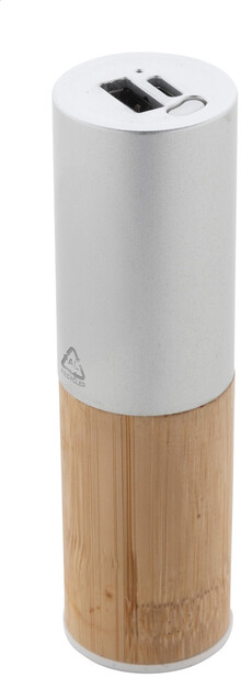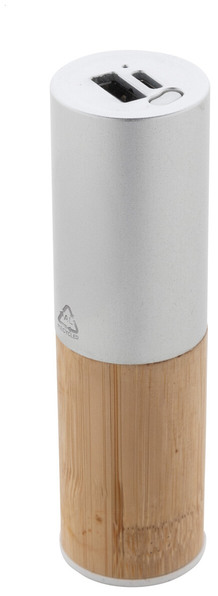 Power banka z recyklovaného hliníku a bambusu s baterií 2600 mAh. S 1 portem USB a 1 portem USB-C pro nabíječku. Vstupní port USB-C. Včetně USB nabíjecího kabelu.