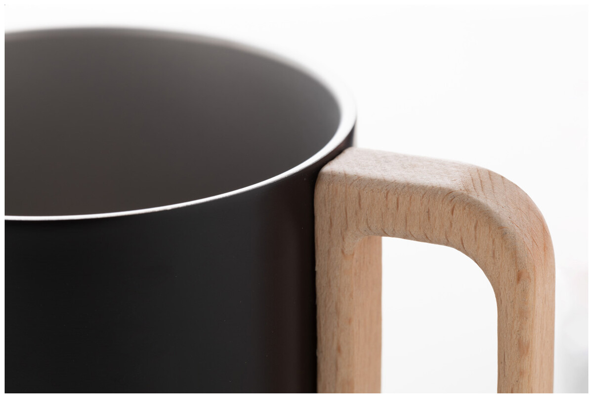 Dvoustěnný termo hrnek z recyklované nerezové oceli s dřevěným uchem. 350 ml.