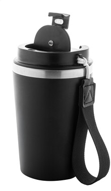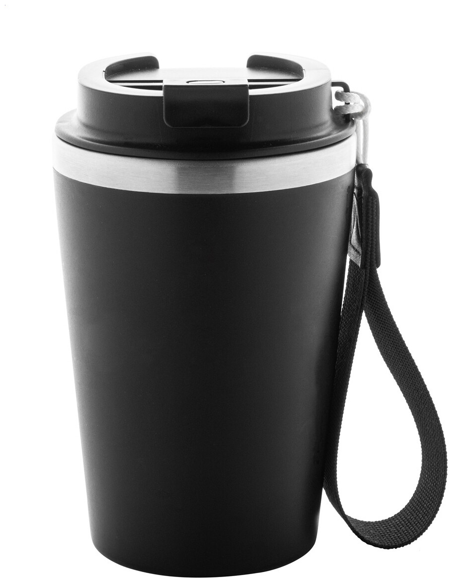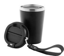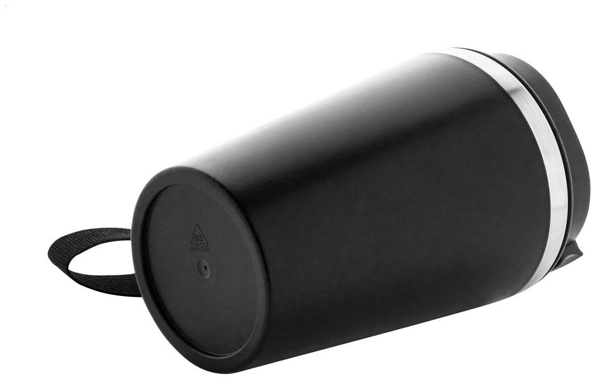 Dvoustěnný termo hrnek z recyklované nerezové oceli s vnějším PP plastem a víčkem na pití. S popruhem na přenášení RPET. 350 ml.