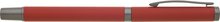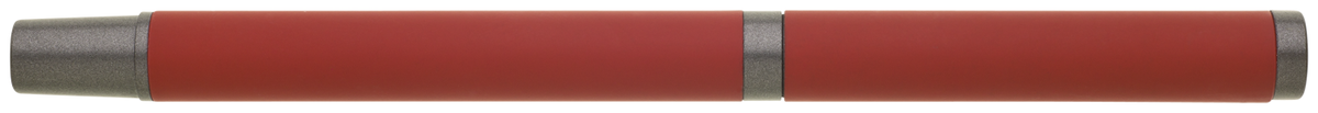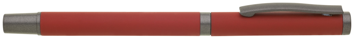 Elegantní kovový roller RIFLO SOFT v červené barvě s tmavě šedými doplňky a pogumovaným povrchem. Náplň v rolleru píše modře.