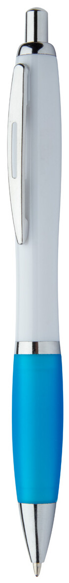 Kuličkové pero z recyklovaného ABS plastu s bílým tělem, barevným úchopem a chromovanými částmi. S modrou náplní.