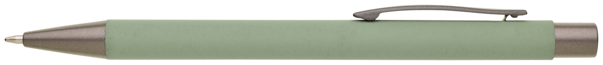 Kovová propiska CAGERI SOFT s hnědo-černými doplňky, se světlou zelenou pogumovanou povrchovou úpravou. Velkoobsahová modrá náplň.